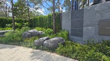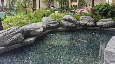 Pavilia Forest features artificial granite rock benches, boulders, along with a giant swimming pool and waterfall with a meandering stream that seamlessly integrates a new world class residential development with architects requests for modern integration of stone, water features and shrubbery.